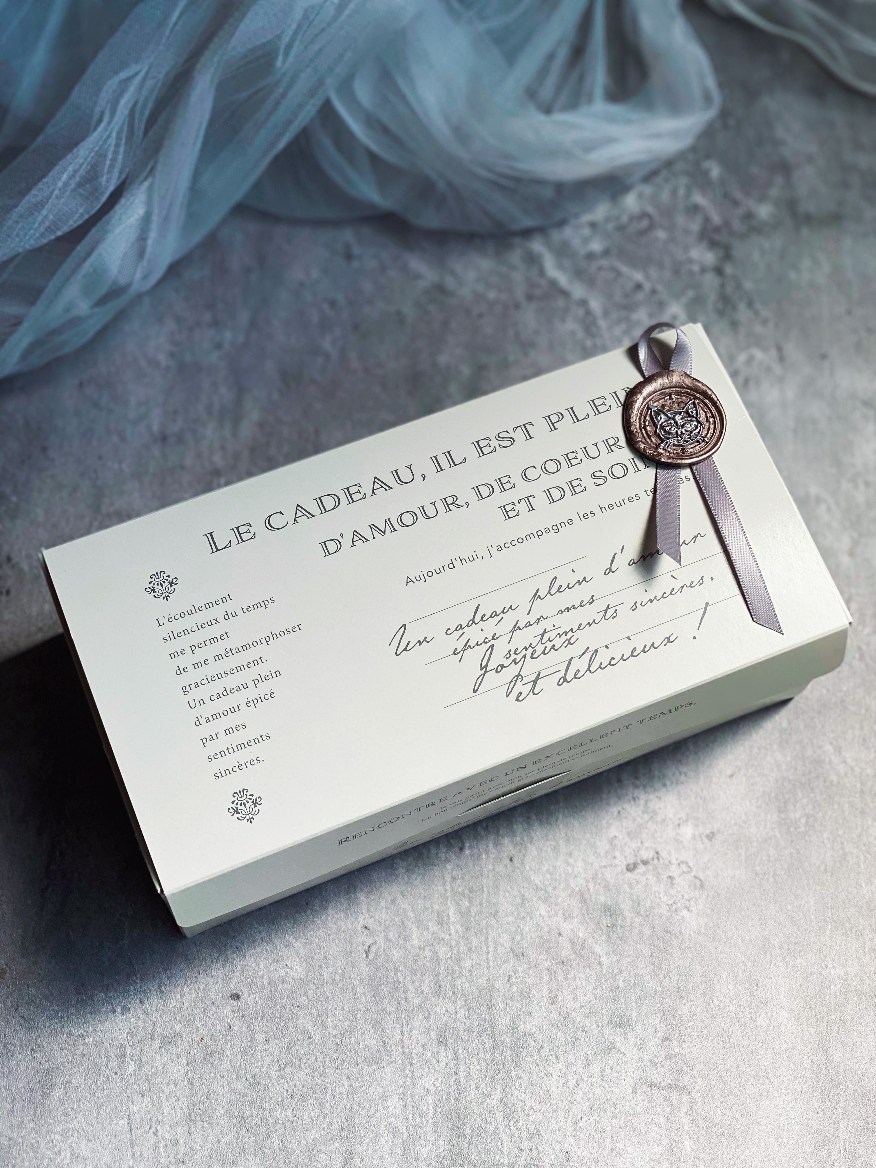 猫ちゃんのシーリングスタンプをあしらったBOXに入れてお届けします。