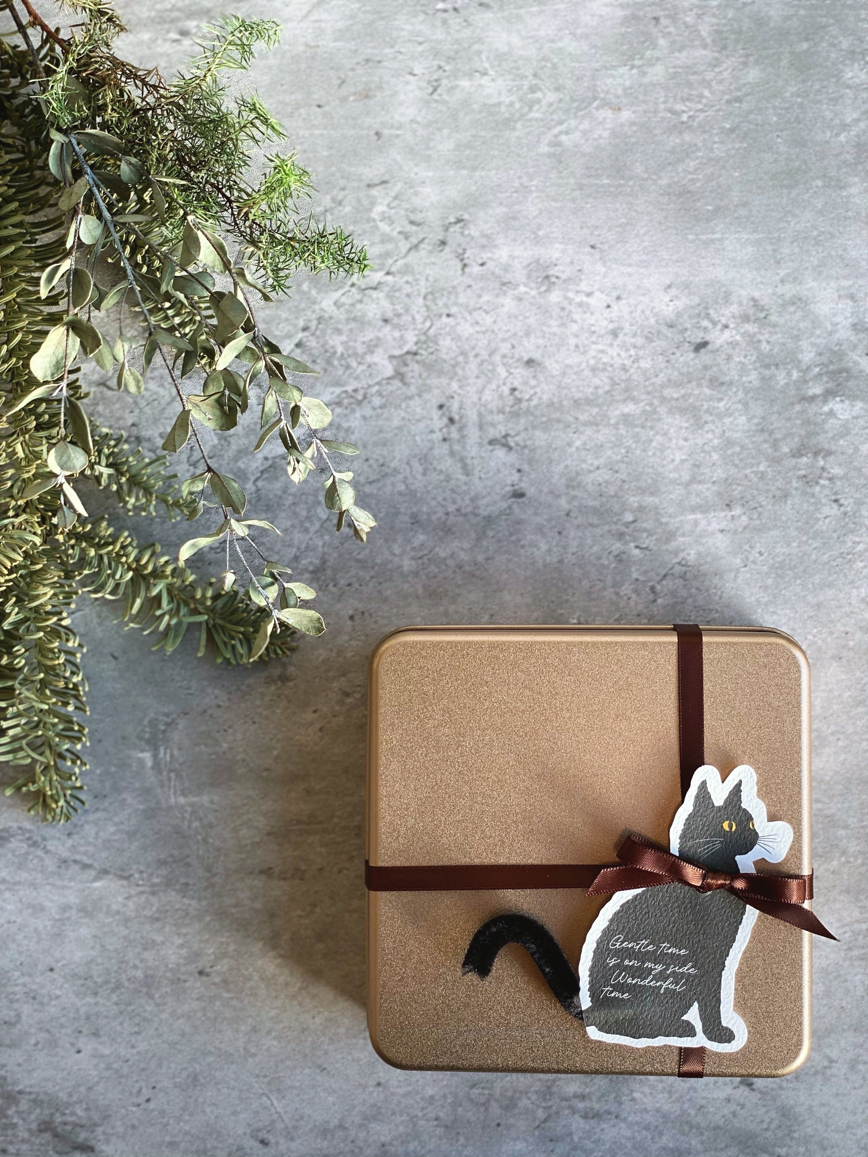 ラッピングには尻尾がモールになっている、可愛らしい黒猫ちゃんのタグをあしらいました。